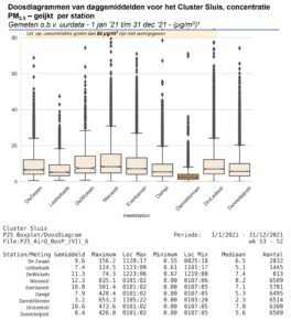 De meetstations in het Sluisgebied laten verontrustende metingen zien over 2021: de concentratie rond alle 8 buitenstations zijn norm overschrijdend voor PM 2.5: deze varieert van x microgram/m3 rond de Leidsekade tot y microgram /m3 in de Nieuwstraat
