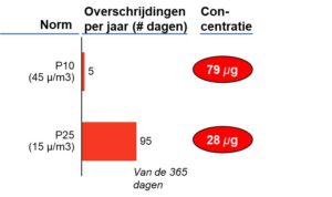 Dat is ruim een factor 2 keer meer dan de grenswaarde van 5 microgram/m3 die de WHO als maximum hanteert. Ook de concentratie van PM10 en stikstof is veel te hoog: een overschrijding van de WHO-grenswaarde met een factor van respectievelijk 1,25 en 2,13.